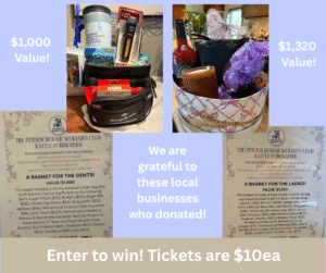 To purchase raffle tickets click HERE or purchase at The Waterhouse during business hours. Proceeds benefit the many charities the PWC supports. Click HERE to learn the contents of each basket and about the charities the PWC supports!